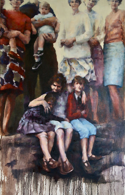 And So the Story Fades (right), is the typical photo of people grouped all together which marked a day many years ago when my family, who lived all over the world, were together, a brief snapshot in time. Using the cropped heads and misty older figures my intention was to describe the passage of time and memory. The foreground figures of children are simultaneously apprehensive and defiant as they dangle their legs over the edge of a stone bridge while the paint drips into the unknown.